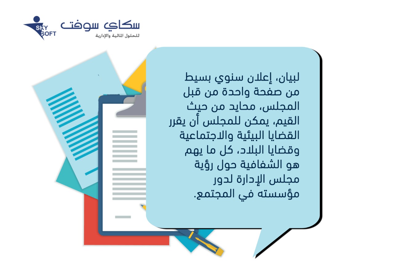 البيان، إعلان سنوي بسيط من صفحة واحدة من قبل المجلس، محايد من حيث القيم، يمكن للمجلس أن يقرر القضايا البيئية والاجتماعية وقضايا البلاد، كل ما يهم هو الشفافية حول رؤية مجلس الإدارة لدور مؤسسته في المجتمع.
